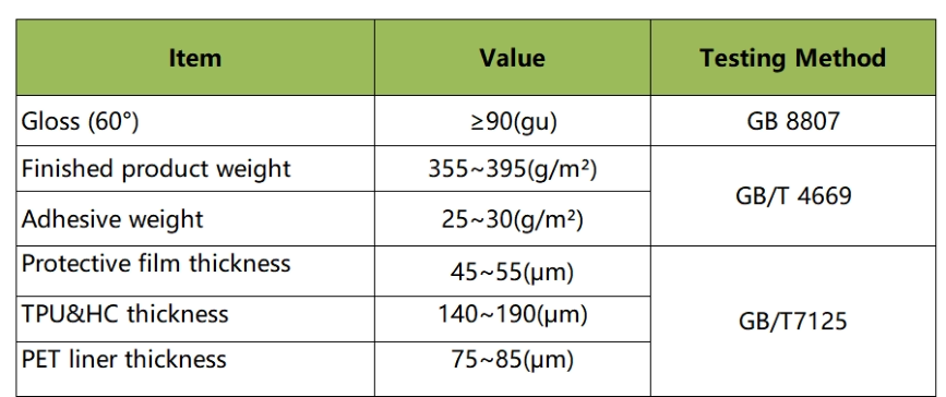 V. Product Typical StructureThe typical structure of a finished color-change film includes: protective film, coating layer, TPU transparent film, colored polyurethane layer, polyurethane layer, pressure-sensitive adhesive, and release liner.Protective Film / 保护膜 (50u, Self-developed)Coating Layer / 涂层 (7u)TPU Transparent Film / TPU 透明膜 (115u)Colored Polyurethane Coating / 聚氨酯色层 (20u, Self-developed)Polyurethane Substrate / 聚氨酯底层 (20u, Self-developed)Pressure-sensitive Adhesive / 压敏胶 (28u)Liner / 离型膜 (75u)VI. Technical StandardsAppearance Standards
