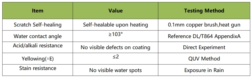 Testing Method Description:•Self-healing Performance: After performing 10 circular scrubbing cycles on the coating surface using a brass brush with wire diameter ≤ 0.1mm, visually inspect the disappearance of fine scratches after heating with a heat gun or 100°C boiling water.•Acid/Alkali Resistance: Apply 10 vol% hydrochloric acid and 0.1 mol/L sodium hydroxide solution to the sample surface. After natural exposure for 24 hours, evaluate the sample for absence of visually detectable coating defects (e.g., bubbles, cracks).•Stain Resistance: Subject the sample to accelerated degradation using equipment with UV radiation, heating, and spraying functions. Parameter settings shall comply with relevant provisions of GB/T16422.2, with general industrial water used for spraying.